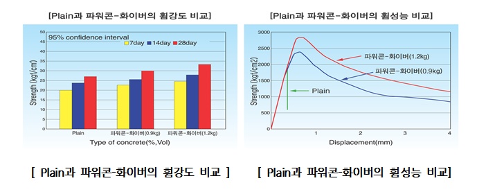- 압축강도 : “파워콘-화이버” 혼입율이 0.065%(0.9kg)일 때, 일반 plain 모르터/콘크리트와 비교하여 28일 강도에서 압축강도 증가에 영향을 미칩니다.