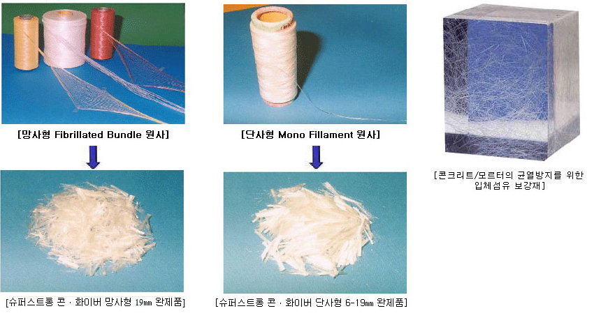 폴리프로필렌 화이버로 된 슈퍼스트롱 콘 ㆍ화이버는 콘크리트/모르토 1m³속에 약 600~850만개의 Fiber가 입체적으로 분포되어 Micro-Reinforcing작용(세근 보강작용)을 해줌으로서 콘크리트의 균열을 억제해줌은 물론,충격,파손,마모,투수,부식 및 동해 등의 여러 가지 콘크리트 성능저해 요인들에 대한 저항능력을 현저히 증대시켜, 총체적으로 콘크리트의 품질을 한 단계 높여주는 신소재입니다.
