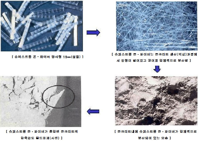 (강도에 대한 영향은 거의 없으므로 현장 배합비 수정없이 단순히 추가하여 사용할 수 있다.) 콘크리트 속에서 슈퍼스트롱 콘ㆍ화이버의 보강기능은 화학자용이 아닌 물리적 작용에 의한 것이며 또한 Fiber의 함량이 극히 미소(용적비 0.1%이하)하여 배합설계에 영향을 미치지 않음