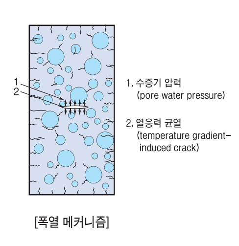 고강도, 고성능콘크리트는 내외부 조직이 치밀하여 화재발생시 고열을 받게 되면 콘크리트내에 존재하는 물, 공기등이 팽창하여 수증기압이 발생하고 이러한 내부 수증기압은 콘크리트의 인장강도를 초과하면 콘크리트 구조체에서 심한 폭음과 함께 박리 및 탈락하는 폭열현상이 발생하게 됩니다.