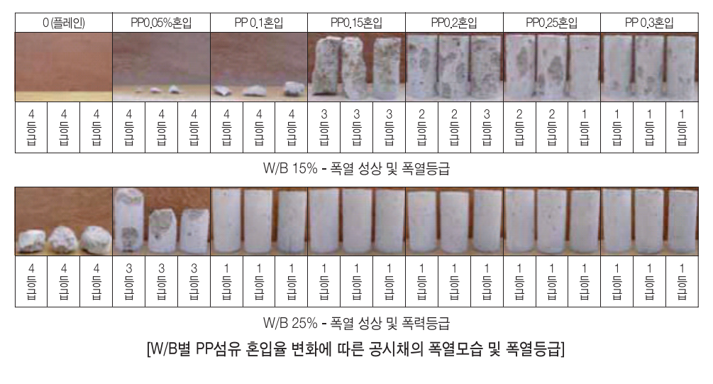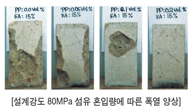 따라서 고강도 및 고성능 콘크리트의 폭열현상을 PP섬유등의 내열성이 작은 Fiber를 일정량 콘크리트에 혼입해 줌으로써 방지될 수 있습니다.