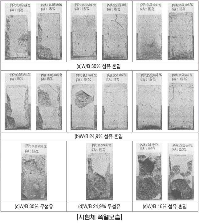 상기 대책 중 가장 간편하고, 저렴하며 효과적인 방안으로는 “⑥의 경우”로 콘크리트내 내열성이 작은 PP섬유, PVA섬유, Nylon섬유등의 유기질 단섬유를 혼입하면 화재시 섬유가 고온에 녹아 내부수증기압을 효과적으로 배출할 수 있는 통로를 형성하여 폭열이 방지됩니다.