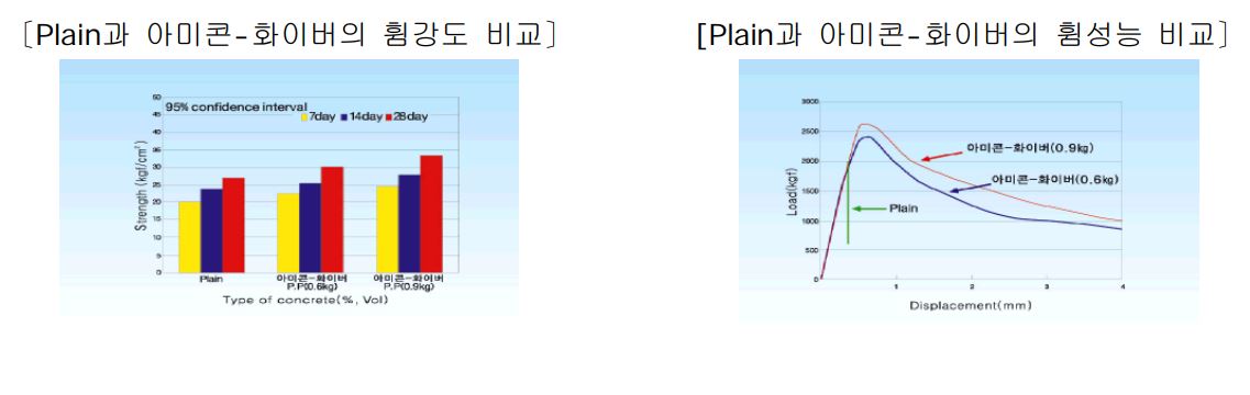 - 휨성능(휨강도 및 휨인성) : 보통 콘크리트의 휨성능과 비교하여 아미콘-화이버는 모든 혼입률에서 휨성능 증가에 영향을 미치며, 특히 0.078% (0.9㎏/㎥)의 혼입률에서 가장 우수한 결과를 보여줍니다.